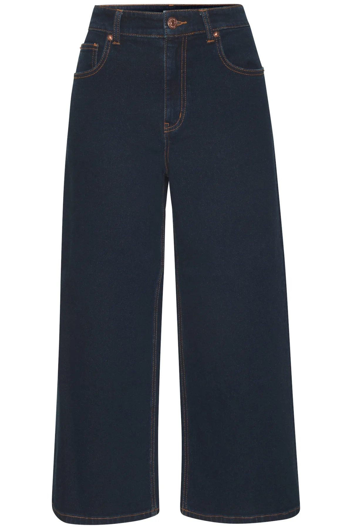 Design: Ritssluiting, 5-pocket-style; Type sluiting: Knoopsluiting; Materiaal: Denim; Motief: Effen; Extra's: Studs, Contrasterende naden, Riemlussen; Wassing: Raw/unwashed; Lengte: 7/8 lengte; Pasvorm: Wide leg; Taillehoogte: High waist