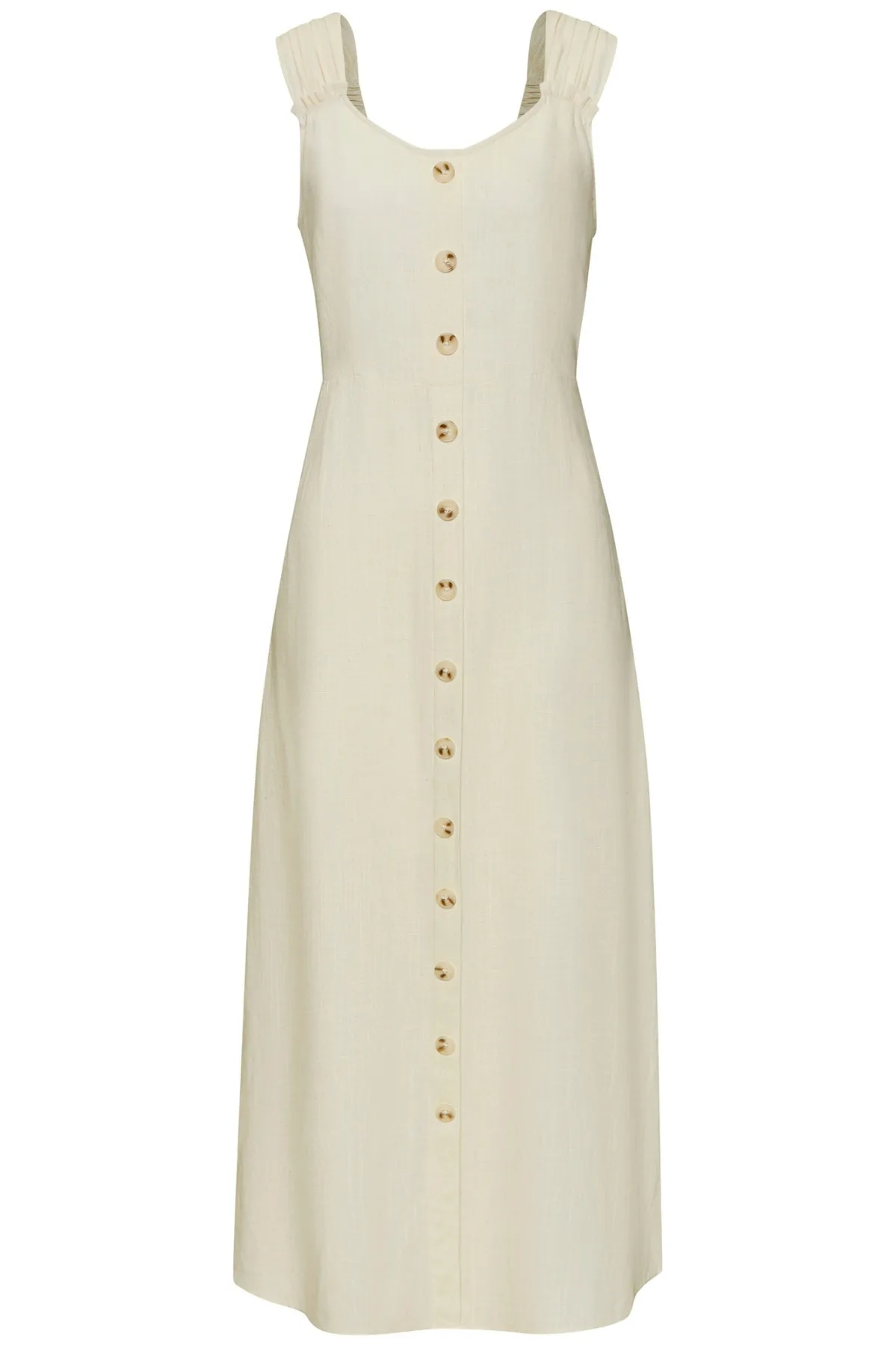 Design: Gevoerde zoom/rand, Knop placket; Type sluiting: Knoopsluiting; Materiaal: Viscose; Halstype: Ronde hals; Motief: Effen; Kraag: Zonder kraag; Soort bandjes: Brede bandjes; Details: Ruches, Gedrapeerd; Extra's: Op staal naden; Lengte: 7/8 lengte; Snit: Getailleerd; Pasvorm: Normale pasvorm; Armlengte: Mouwloos