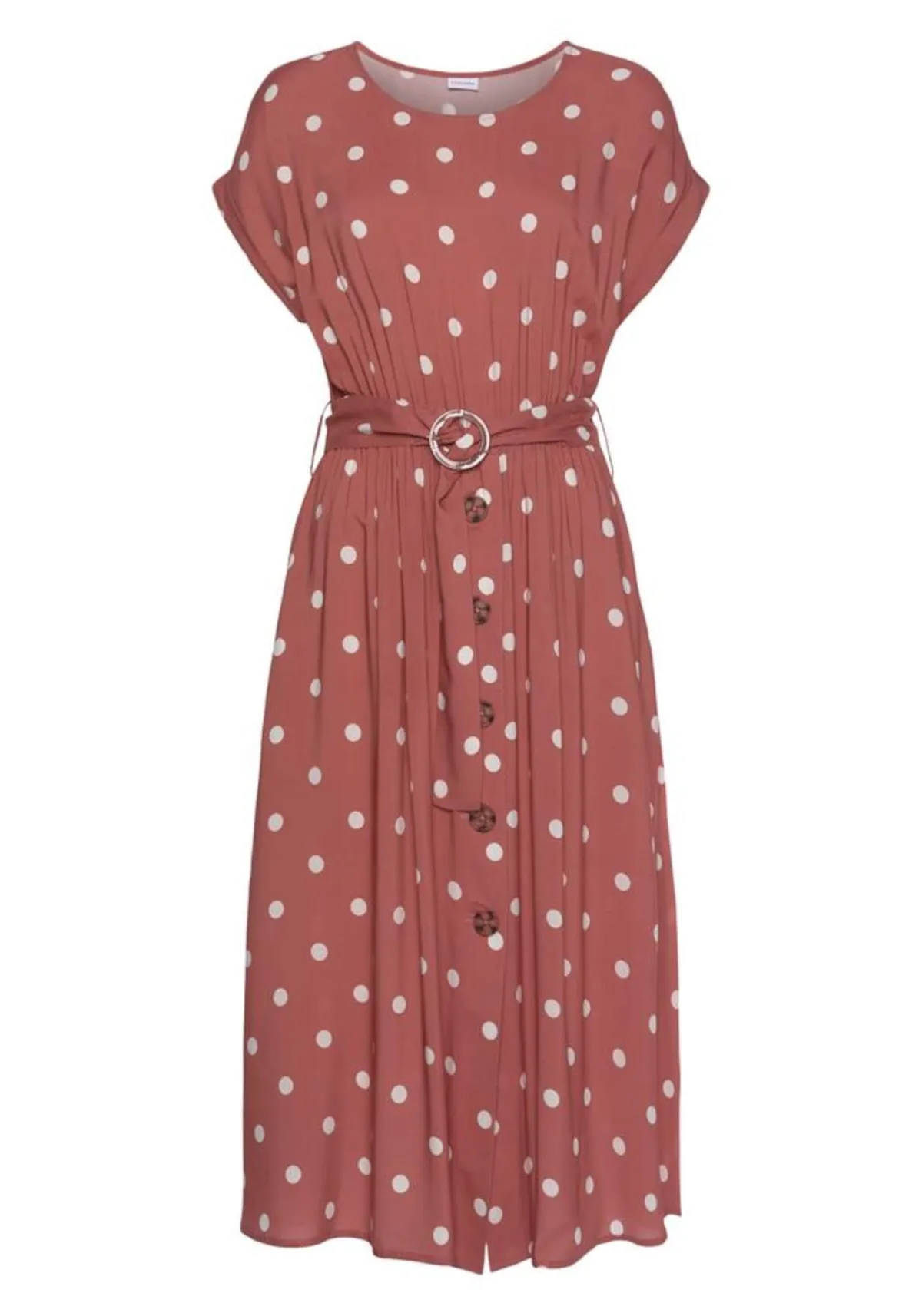 Design: Gevoerde zoom/rand, Gesneden mouw, Mouw revers, Knop placket, Tailleriem; Materiaal: Viscose; Halstype: Ronde hals; Motief: Gestippeld; Details: Gedrapeerd; Extra's: All-over patroon, Gladde stof, Lichte stof; Lengte: 3/4 lengte; Pasvorm: Normale pasvorm; Armlengte: Kwartmouw