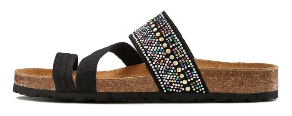 Design: Anatomisch gevormd voetbed, Profielzolen, Elastische inserts, Zool van kurk; Schoenneus: Open toe; Extra's: Met halfedelstenen, Glitterend, Runderleer, Flexibele zool; Hakhoogte: Platte hak (0-3 cm)
