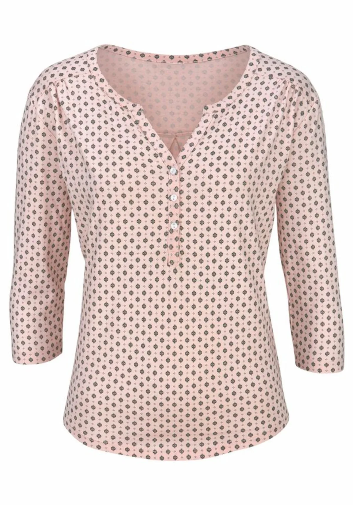 Blouse type: Blouseshirt; Design: Knop placket; Type sluiting: Knoopsluiting; Materiaal: Jersey; Halstype: Uitgesneden hals; Kraag: Zonder kraag; Extra's: All-over patroon, Op staal naden, Voelt zacht aan; Pasvorm: Normale pasvorm; Armlengte: Driekwart mouw; Lengte: Normale lengte
