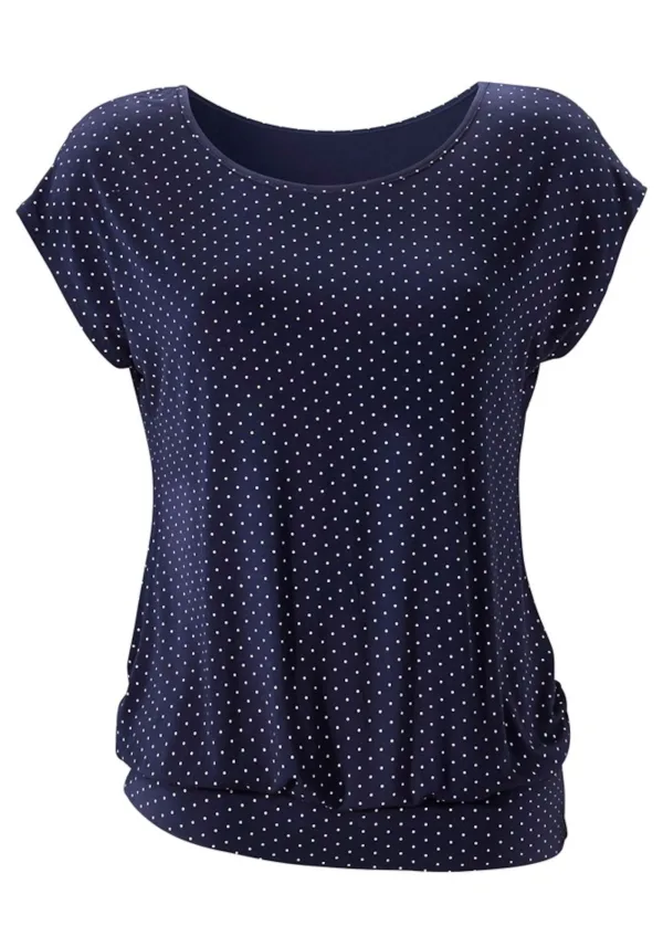 Design: Wijde taille, Overige kragen; Materiaal: Jersey, Viscose; Halstype: Ronde hals; Motief: Gestippeld; Details: Gedrapeerd; Extra's: Op staal naden, Gladde stof, Voelt zacht aan; Pasvorm: Normale pasvorm; Armlengte: Kwartmouw; Lengte: Normale lengte