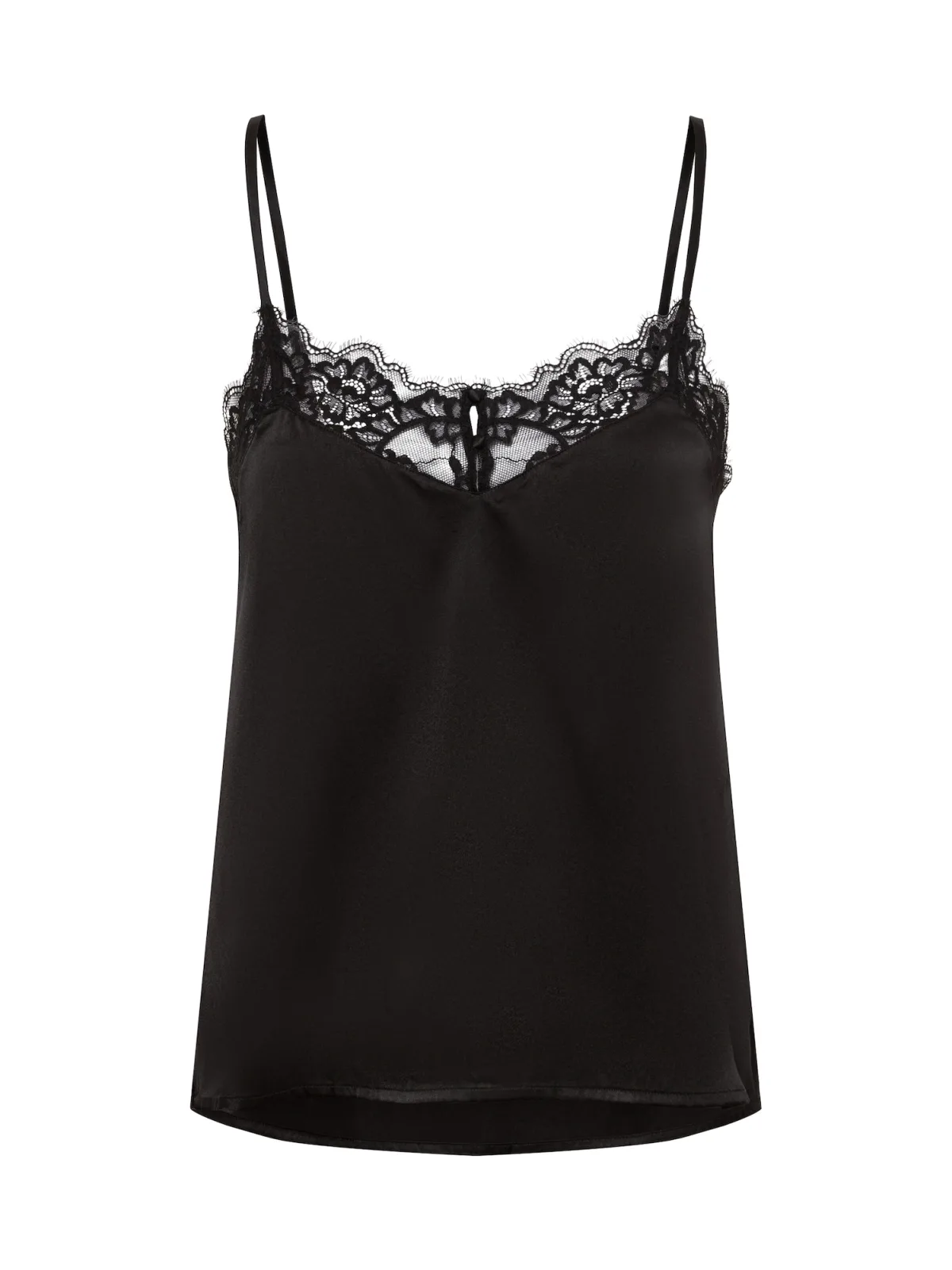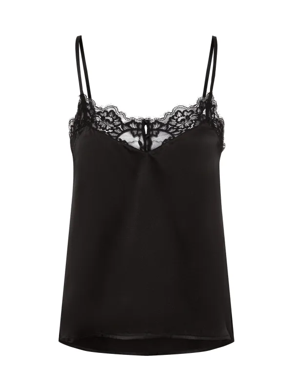 Materiaal: Zijde; Halstype: V-hals; Motief: Effen; Soort bandjes: Spaghettibandjes; Details: Kant; Extra's: Verstelbare bandjes, Op staal naden, Fijne stof; Pasvorm: Normale pasvorm; Armlengte: Mouwloos; Lengte: Normale lengte