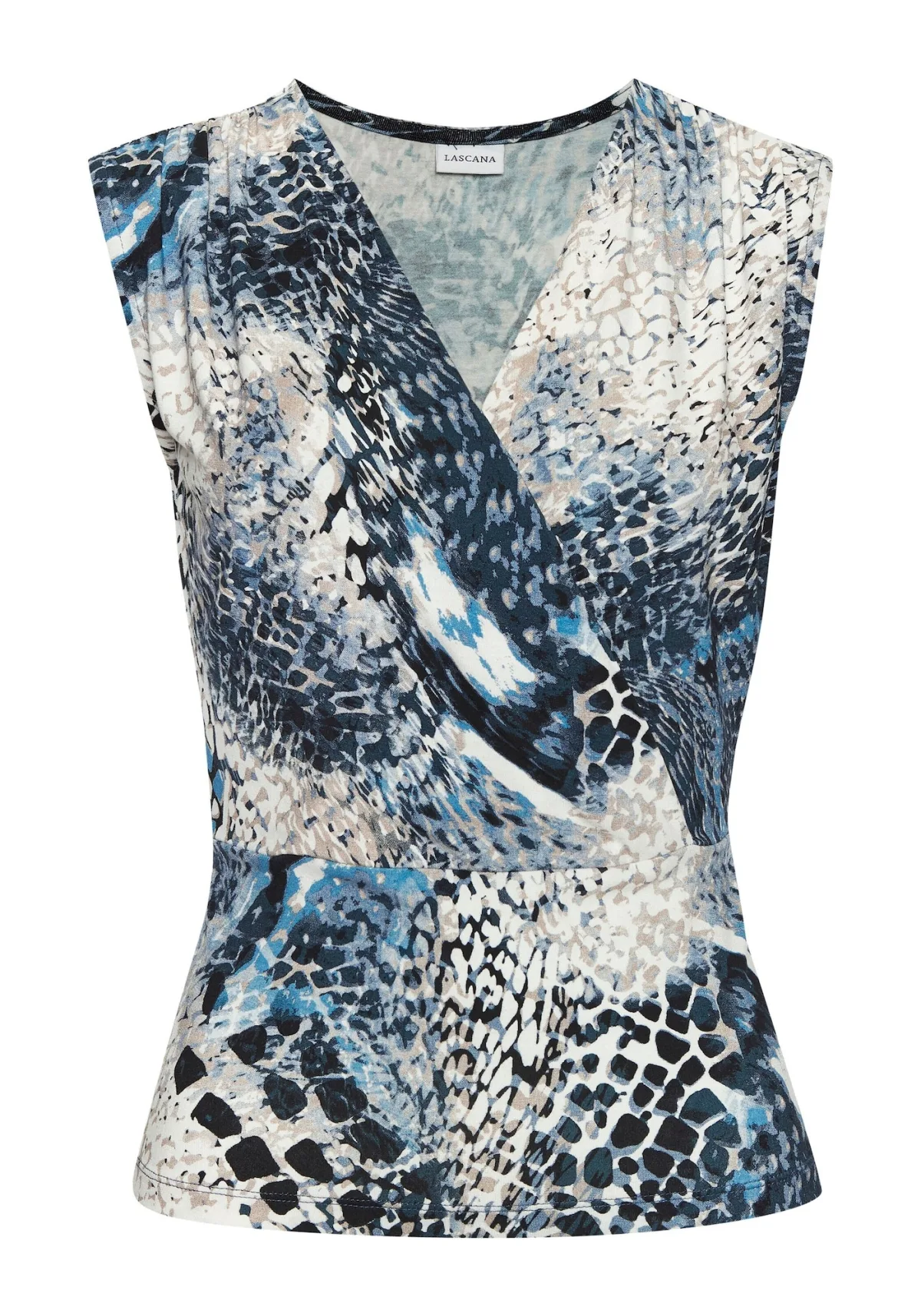 Blouse type: Blouseshirt; Design: Wikkel-look; Materiaal: Jersey; Halstype: V-hals; Motief: Dierenprint; Kraag: Zonder kraag; Soort bandjes: Brede bandjes; Details: Gedrapeerd; Extra's: All-over patroon; Pasvorm: Slanke pasvorm; Armlengte: Mouwloos; Lengte: Normale lengte