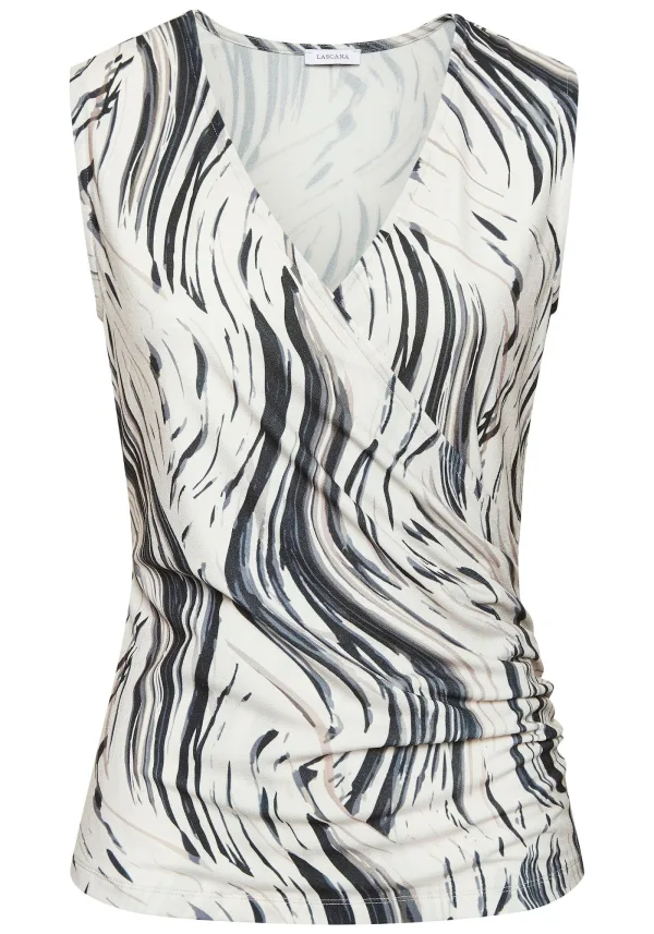 Blouse type: Blouseshirt; Design: Wikkel-look; Halstype: V-hals; Kraag: Zonder kraag; Soort bandjes: Brede bandjes; Details: Gedrapeerd, Wikkel design; Extra's: All-over patroon; Pasvorm: Aansluitende pasvorm; Armlengte: Mouwloos; Lengte: Normale lengte