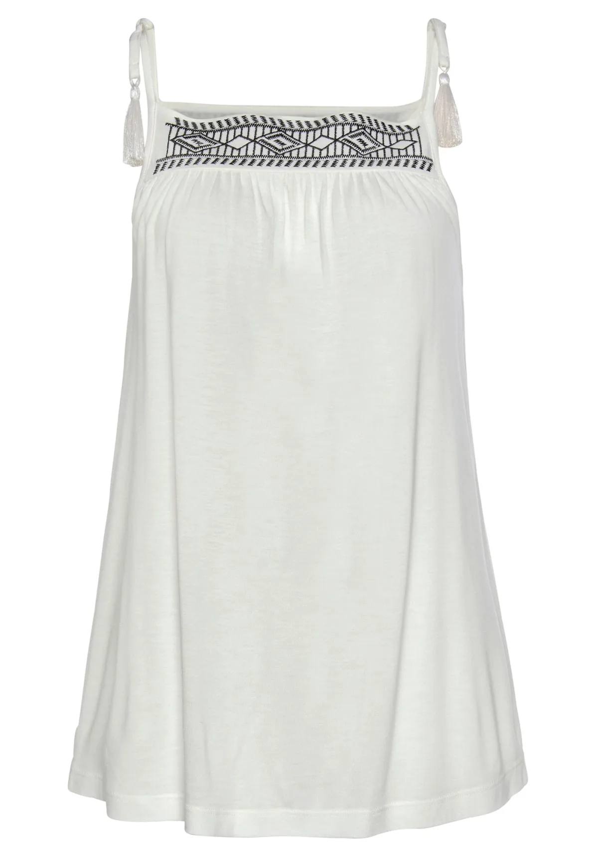 Materiaal: Viscose; Halstype: Carréhals; Motief: Aztec print; Soort bandjes: Spaghettibandjes; Details: Borduursels; Pasvorm: Losse pasvorm; Armlengte: Mouwloos; Lengte: Normale lengte
