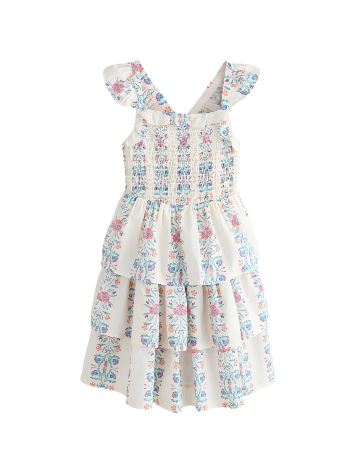 Design: Elastische taille/zoom; Materiaal: Katoen; Halstype: Carréhals; Motief: Bloemenprint; Details: Cut-outs, Ruches, Volant; Extra's: All-over patroon; Lengte: Knielengte; Snit: Getailleerd; Pasvorm: Normale pasvorm; Armlengte: Mouwloos