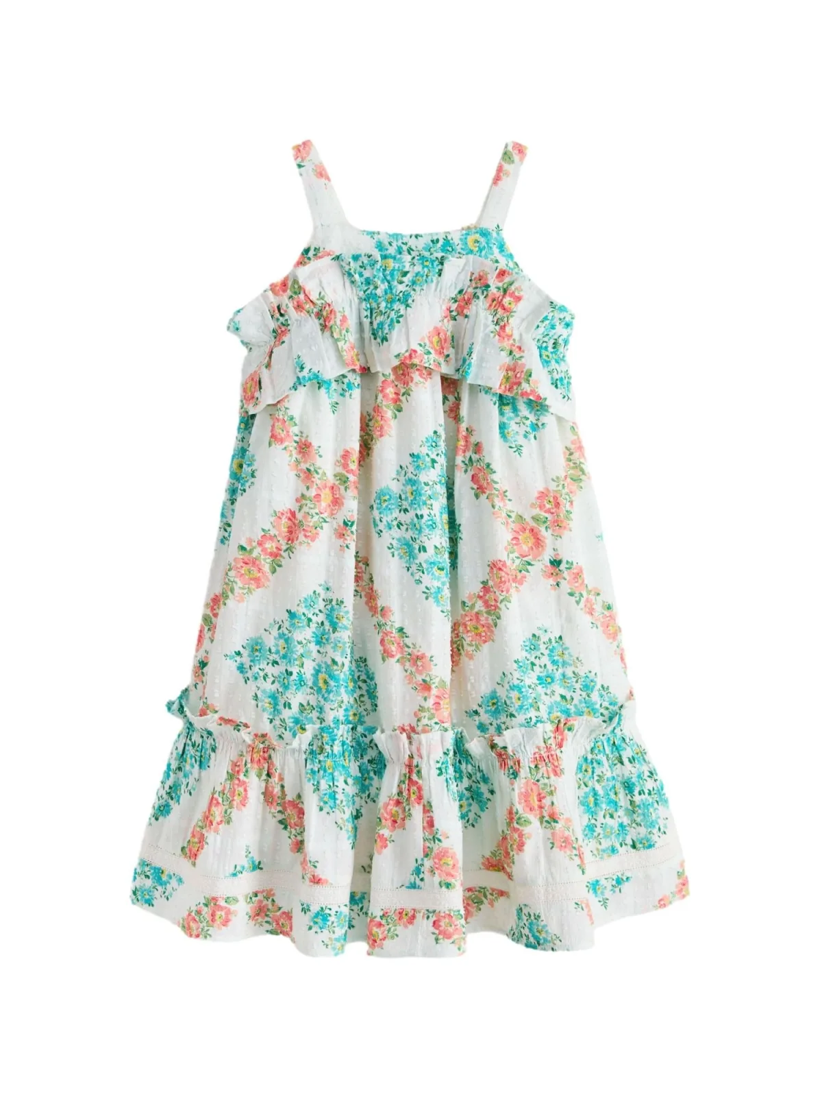 Design: Gevoerde zoom/rand, Keyholesluiting; Type sluiting: Knoopsluiting; Materiaal: Katoen; Halstype: Carréhals; Motief: Bloemenprint; Soort bandjes: Normale bandjes; Details: Cut-outs, Ruches, Volant, Gedrapeerd; Extra's: All-over patroon; Lengte: Knielengte; Snit: Uitlopend; Pasvorm: Losse pasvorm; Armlengte: Mouwloos