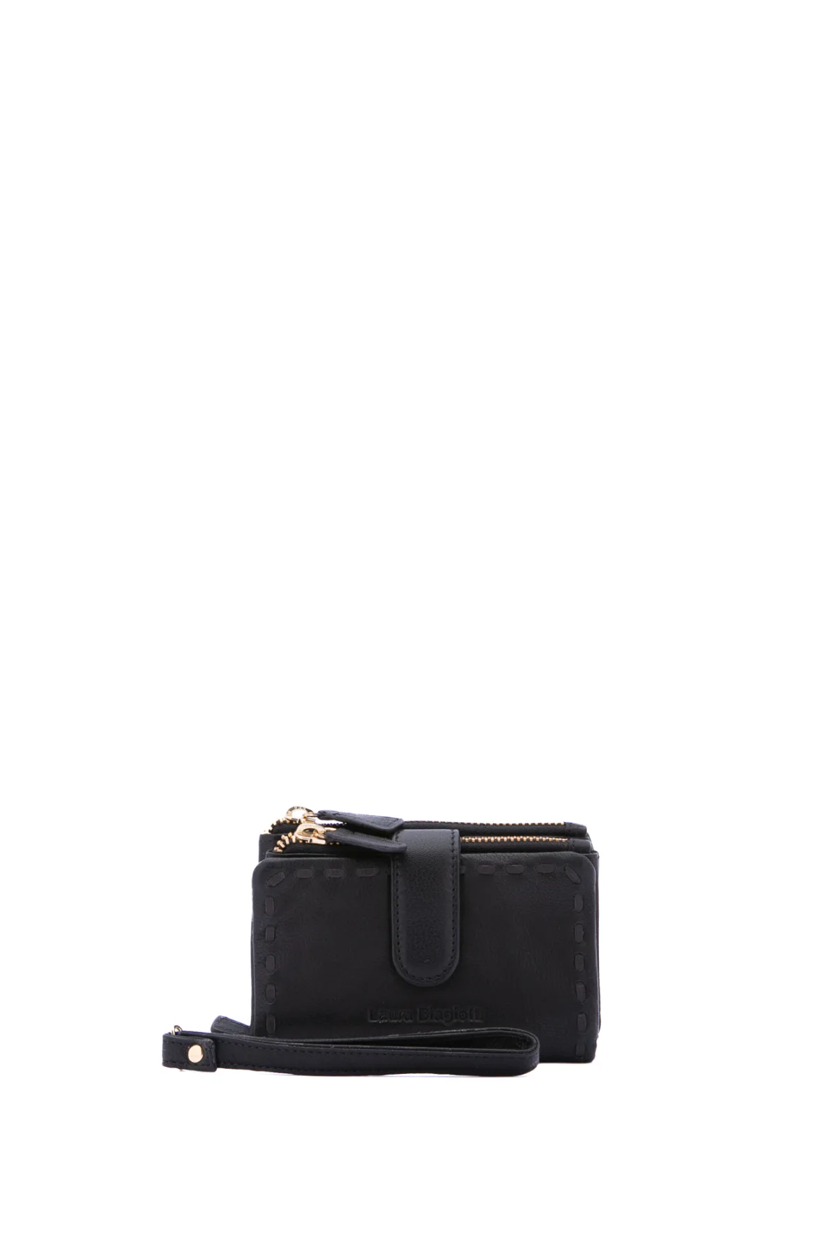 Damesportemonnee met drukknoopsluiting. twee met ritssluiting, kaarthouder en binnenvakken voor bankbiljetten. afwezige externe zakken. ontbrekende schouderband. in eco-leer handvat. Drie binnenvakken. extern materiaal. gevoerd met polyester binnenkant. Afmetingen: 13x9x3 cm. Modeproduct