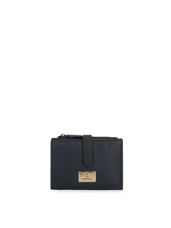 Damesportemonnee met drukknoopsluiting. binnenzakken voor kaarthouder en bankbiljettenhouder. afwezige externe zakken. ontbrekende schouderband. ontbrekend handvat. een binnencompartiment. extern materiaal. gevoerd met echt lederen interieur. Afmetingen: 12,5x10x1,5 cm. Modeproduct