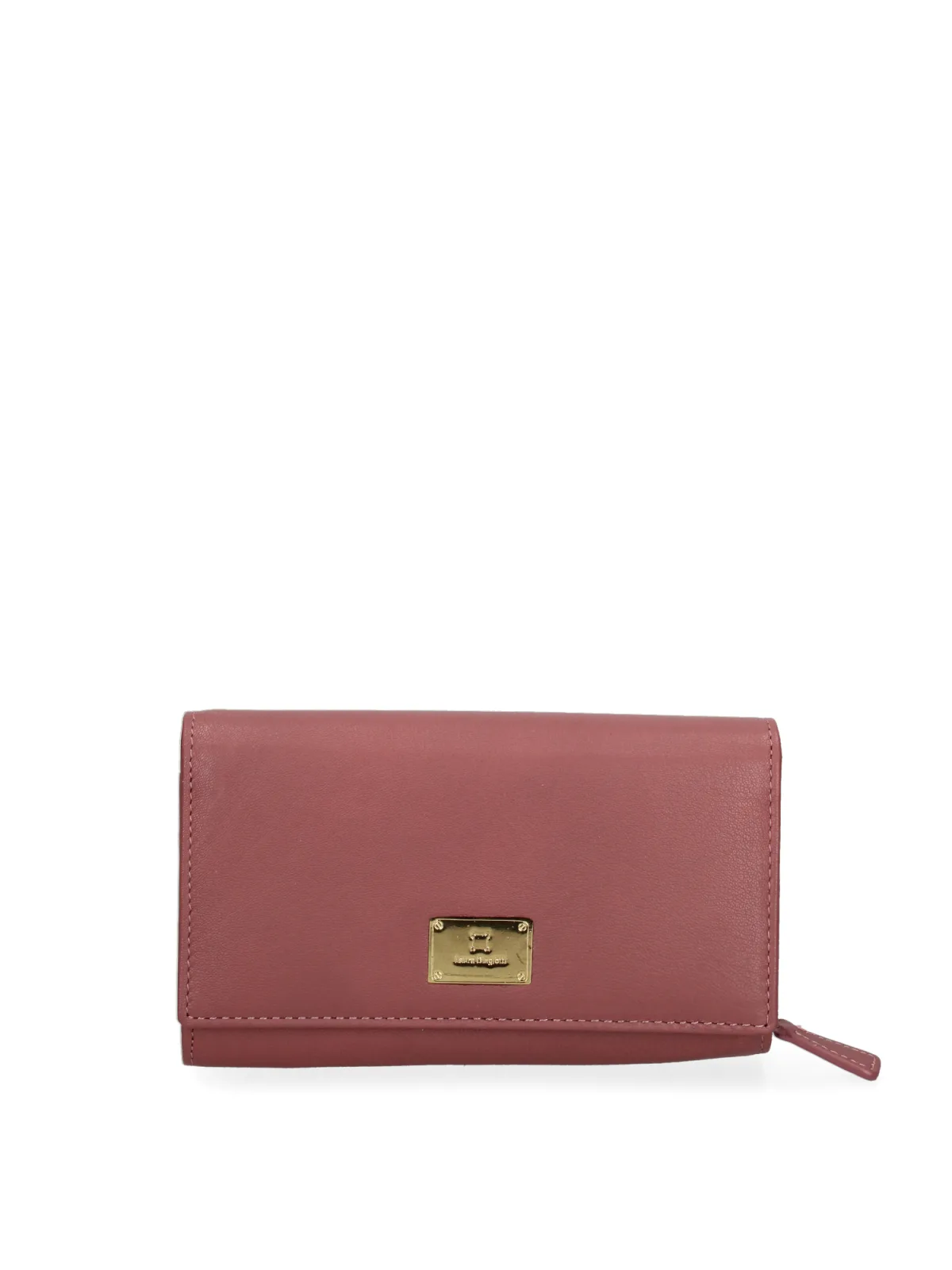 Damesportemonnee met drukknoopsluiting. kaarthouder en bankbiljettenhouder met binnenvakken met ritssluiting. een achterste met externe clipzakken. ontbrekende schouderband. ontbrekend handvat. een binnencompartiment. extern materiaal. gevoerd met echt lederen interieur. Afmetingen: 17x10x4 cm. Modeproduct