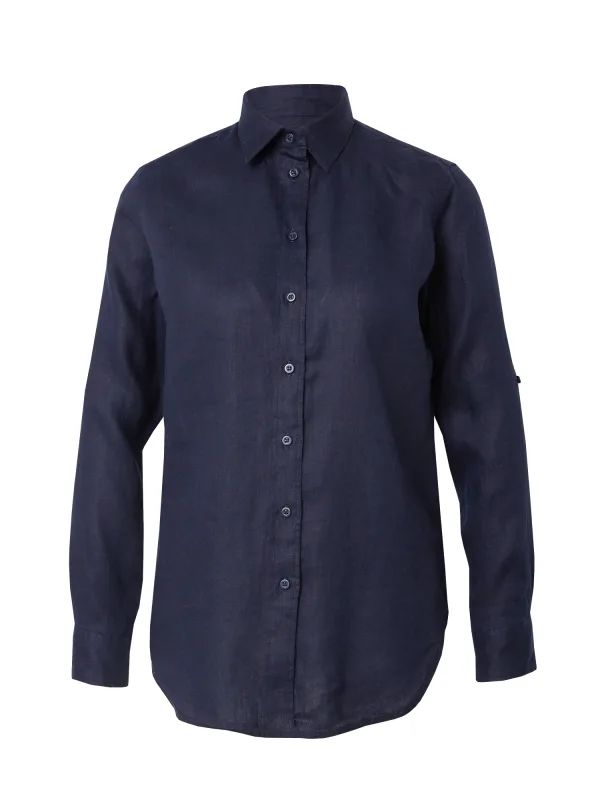 Blouse type: Klassieke blouse; Design: 1-knoops manchetten, Afgeronde manchetten, Ronde zoom; Type sluiting: Knoopsluiting; Materiaal: Linnen; Motief: Effen; Kraag: Kentkraag; Details: Gedrapeerd; Extra's: Op staal naden, Lichte stof; Pasvorm: Normale pasvorm; Armlengte: Lange mouw; Lengte: Normale lengte