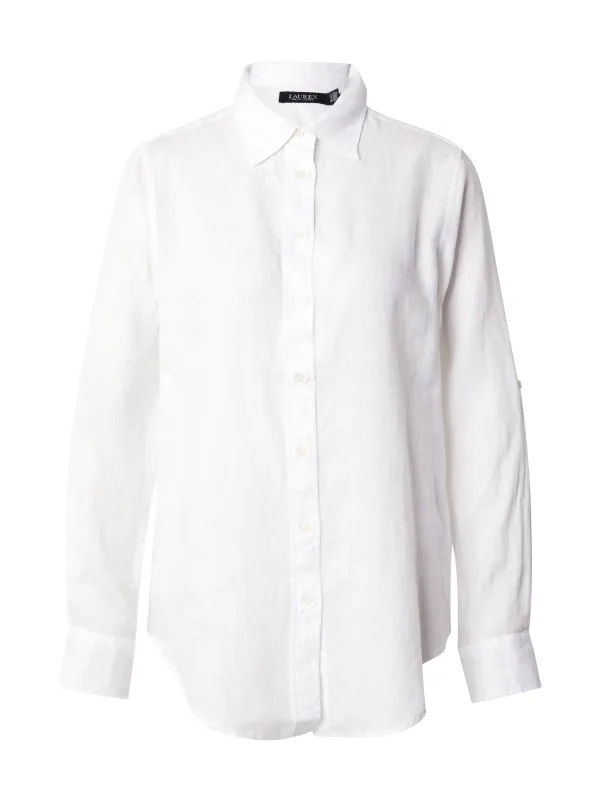 Dames linnen overhemd van Lauren Ralph Lauren;look: effen;Pasvorm: relaxed fit;Overhemdkraag: puntkraag;Knoopsluiting: doorlopend;Applicatie: reliëflogo aan de knopen;Details: achterpas;Sluiting: enkele knoopsluiting;Mouwvorm: lange mouw met turn-up-optie;mouwboord: manchet;Rompzoom: licht afgerond;materiaalverwerking: gevlamd garen;Materiaal: puur linnen