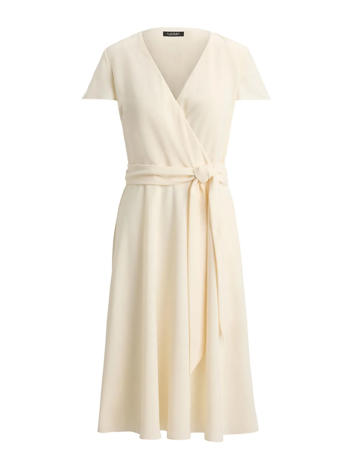 Design: Gevoerde zoom/rand, Rechte zoom, Diepe snit/decolleté, Tailleriem; Materiaal: Gerecycled materiaal; Halstype: Wikkeltop; Motief: Effen; Details: Wikkel design; Extra's: Op staal naden, Gladde stof, Milieuvriendelijk geproduceerd; Lengte: Knielengte; Snit: Getailleerd; Pasvorm: Normale pasvorm; Armlengte: Kwartmouw