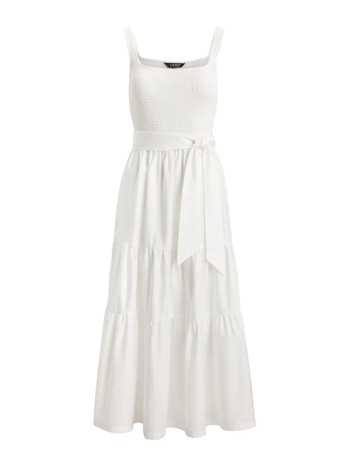 dames vrijetijdsjurk van Lauren Ralph Lauren;look: effen;pasvorm/model: A-lijn;Lengte: midi;hals: vierkante hals;Applicatie: volants;model met bandjes: brede bandjes;Materiaal: puur katoen