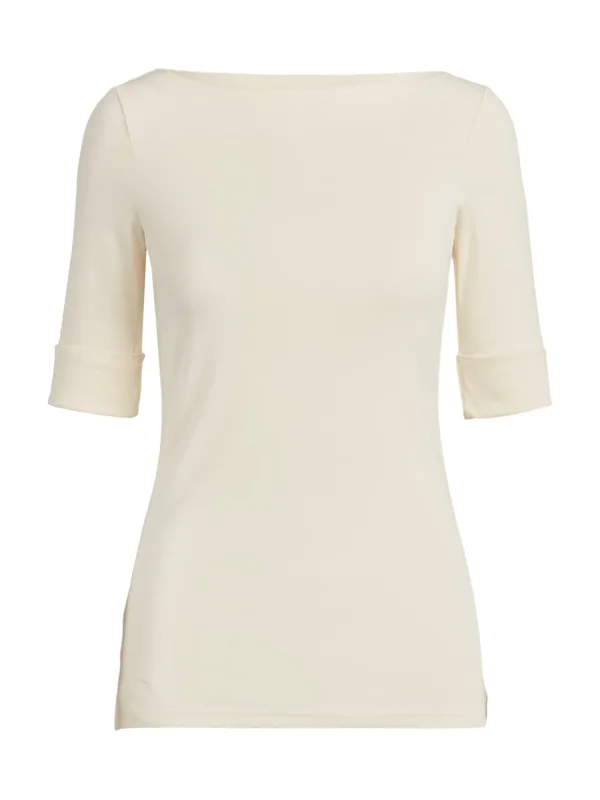 Dames T-shirt van Lauren Ralph Lauren;look: effen;pasvorm: slim fit;hals: boothals;mouwvorm: 1/2-mouwen;Mouwboord: geribd, met omslag;Materiaal: puur katoen