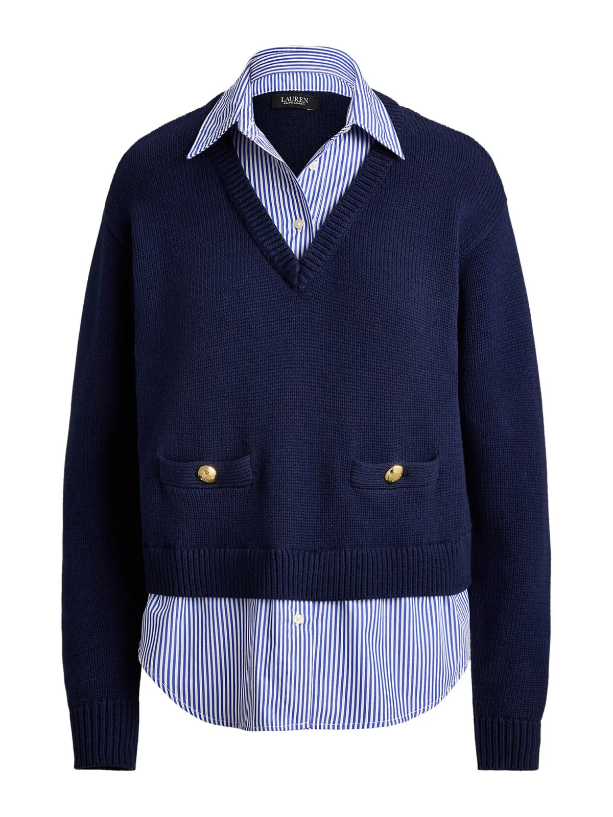 dames gebreide pullover van Lauren Ralph Lauren;Look: gebreide look;Pasvorm: regular fit;Motief: gestreepte inzet;Applicatie: reliëflogo;kraagmodel: o-neck;hals: diepe V-hals;Mouwvorm: lange mouw;Mouwboord: geribd;rompzoom: geribd;materiaalverwerking: knitwear;Materiaal: puur katoen