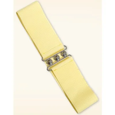 Deze Lauren Vintage stretchriem is dé ideale riem om iedere vintage outfit helemaal mee af te maken! Gemaakt van breed zachtgeel elastiek met een zilverkleurige gesp die sluit in de taille. Draag haar in combinatie met onze swing jurken om je taille te accentueren voor een prachtig silhouet! * Elastisch
