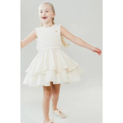 Deze Le Chic meisjesjurk offwhite is een korte jurk met een glimmende textuur die direct zorgt voor een feestelijke uitstraling. De effen kleur maakt het ontwerp rustig en elegant. De mouwloze vorm en de ronde hals geven een luchtig en comfortabel gevoel, ideaal voor warme dagen of een speciale gelegenheid binnen.Stijlvolle details voor bijzondere momenten Korte meisjesjurk in offwhite met glimmende structuur Mouwloos model met ronde hals voor een open en lichte look Gemaakt van 100 procent polyester voor een soepele stof Effen ontwerp dat goed tot zijn recht komt op foto’s Blinde ritssluiting achter voor een rustig rugpand Geen zakken voor een strak en verzorgd silhouetComfortabel en feestelijk in éénMet de korte lengte beweegt de jurk makkelijk mee tijdens spelen en dansen. De gladde binnenkant voelt prettig aan op de huid. De blinde ritssluiting aan de achterzijde maakt aan en uit trekken eenvoudig, terwijl de bovenkant mooi aansluit rond de hals en schouders.Le Chic als vertrouwde keuzeLe Chic richt zich op meisjeskleding met aandacht voor verfijnde details en draagcomfort. Het merk combineert kindvriendelijke pasvormen met nette afwerkingen, zodat de kleding geschikt is voor zowel alledaagse momenten als feestelijke gelegenheden.Een glanzende basis voor dagen waarop het extra bijzonder mag zijn.