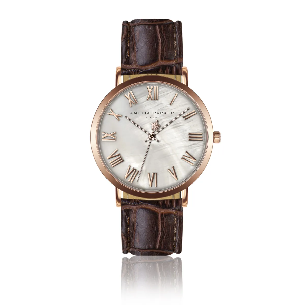 Met de klassieke combinatie van gouden Romeinse cijfers rose op een gestructureerde crème achtergrond en geaccentueerd door het iconische tortue zeejuweel Amelia Parker op de secondewijzer, voor Amelia Parker, viert dit horloge tijdloze charme.Stijlnaam: Classique Brown Leather Kastmaat mm: 36Materiaal kast: Metaal samenstellingKleur kast: Goud rose Kast plating: Ionische plating (IP)Armbandmaat mm: 18X16Materiaal behuizing: Echt leerKleur behuizing: Bruin krokodillenleerKleur behuizing: ParelmoerGlas: Gehard mineraalglasAchterkant behuizing: Roestvrij staalWaterbestendigheid: 3 ATM