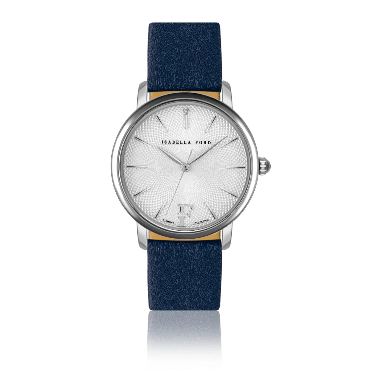 In prachtig koud zilver heeft Isabella Ford dit luxe stuk gecreëerd voor vrouwen die houden van eigentijds gepolijst look. Een ultra-minimalistisch ontwerp laat een enkele met de hand aangebrachte echte diamant het middelpunt vormen. Isabella Ford draagt Adore op aan die briljante vrouwen wier garderobes een lichtere, eenvoudigere en mooiere manier van accessorising vieren. Style Name: Adore Blue Leather Case Size mm: 36Case Material: Metal CompositionCase Colour: SilverCase Plating: Ionic Plating (IP)Bracelet Size mm: 18X16Bracelet Material: Genuine LeatherBracelet Colour: Dark BlueDial Colour: Sunset SilverGlas: Hardened Mineral CrystalDiamond Details: Cut: Single; Clarity: I-3; Kleur: Upper crystal;Case back: Roestvrij staalWaterbestendigheid: 3 ATM