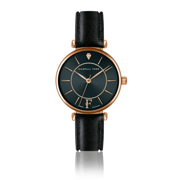Met een elegante sunray zwarte wijzerplaat perfect aangevuld met levendige gouden details rose, is dit luxe uurwerkIsabella Ford 's eerbetoon aan dynamische tweekleurige accessoires en verfijnde functionaliteit. Opgedragen aan chique vrouwen die van design houden, schittert een prachtige met de hand aangebrachte echte diamant om middernacht.Modelnaam: Portia Zwart Leather Kastmaat mm: 32Kastmateriaal: MetaalsamenstellingKastkleur: Goud rose Case Plating: Ionische Plating (IP)Armbandmaat mm: 14X12Armbandmateriaal: Echt LeerArmbandkleur: ZwartWijzerplaatkleur: Zwart SunrayGlas: Gehard Mineraal KristalDiamant Details: Cut: Single; Clarity: I-3; Kleur: Upper crystal;Case back: Roestvrij staalWaterbestendigheid: 3 ATM