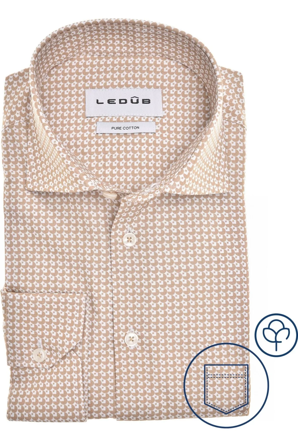 Ledub modern fit overhemd popeline beige met wit dessin Strijkvriendelijk...