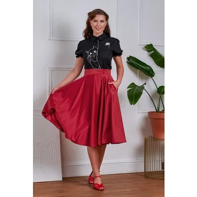 “For the women who turn moments into history.” Dit fifties pareltje is voorzien van sierknoopjes bij de taille, vanwaar zij uitloopt in een klassieke, elegante full swing rok. Uitgevoerd in een stevige maar soepel vallende, lipstickrode stof (stretcht amper) met de look and feel van luxe satijn. * Full swing rok * Sierknoopjes * Zijwaartse steekzakken * Rits- en haaksluiting achterzijde * Kan gecombineerd worden met een van onze petticoats * Valt bij een lengte van 1,70 m over de knie