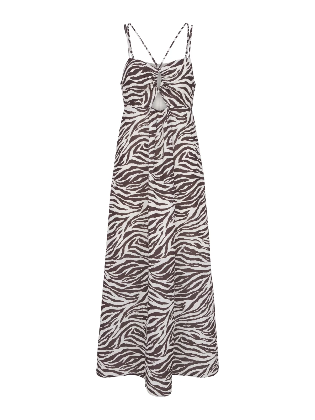Design: Gevoerde zoom/rand, Rug rits; Type sluiting: Ritssluiting; Halstype: V-hals; Motief: Dierenprint; Soort bandjes: Spaghettibandjes; Details: Cut-outs, Gedrapeerd; Extra's: Verstelbare bandjes, All-over patroon, Gladde stof; Lengte: 7/8 lengte; Snit: Uitlopend; Pasvorm: Normale pasvorm; Armlengte: Mouwloos