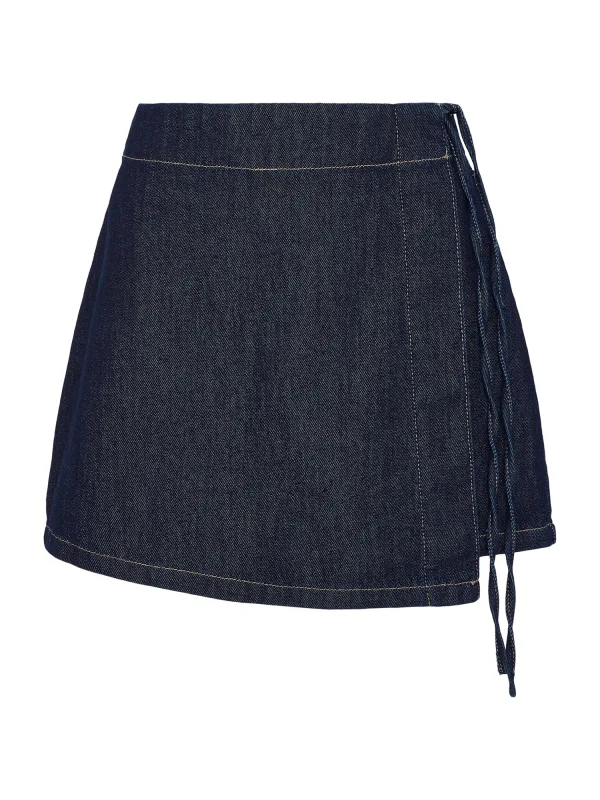 Design: Gevoerde zoom/rand, Asymmetrische zoom, Om te knopen/binden; Materiaal: Denim; Motief: Effen; Rokvorm: A-lijn rok; Details: Wikkel design; Extra's: Contrasterende naden, Stevige stof; Lengte: Kort/mini; Pasvorm: Normale pasvorm