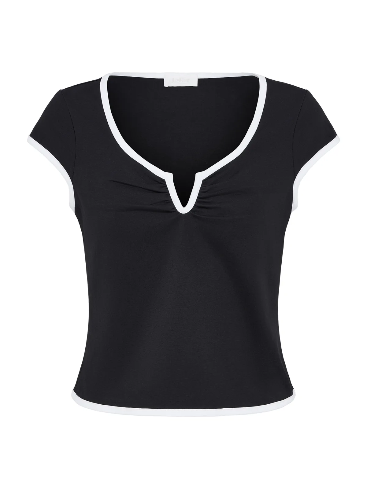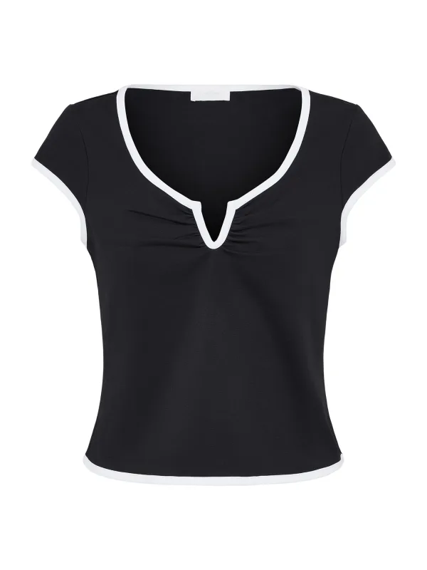 Design: Gevoerde zoom/rand, Nektape; Materiaal: Jersey; Motief: Effen; Details: Gedrapeerd; Extra's: Op staal naden, Voelt zacht aan; Pasvorm: Normale pasvorm; Armlengte: Kwartmouw; Lengte: Normale lengte