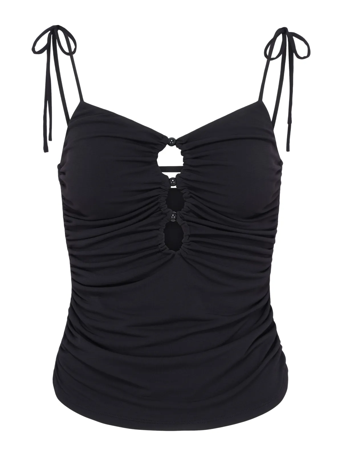 Design: Gevoerde zoom/rand, Om te knopen/binden; Materiaal: Jersey; Motief: Effen; Soort bandjes: Spaghettibandjes; Details: Cut-outs, Gedrapeerd; Extra's: Op staal naden, Buigzame grip; Pasvorm: Slanke pasvorm; Armlengte: Mouwloos; Lengte: Korte pasvorm