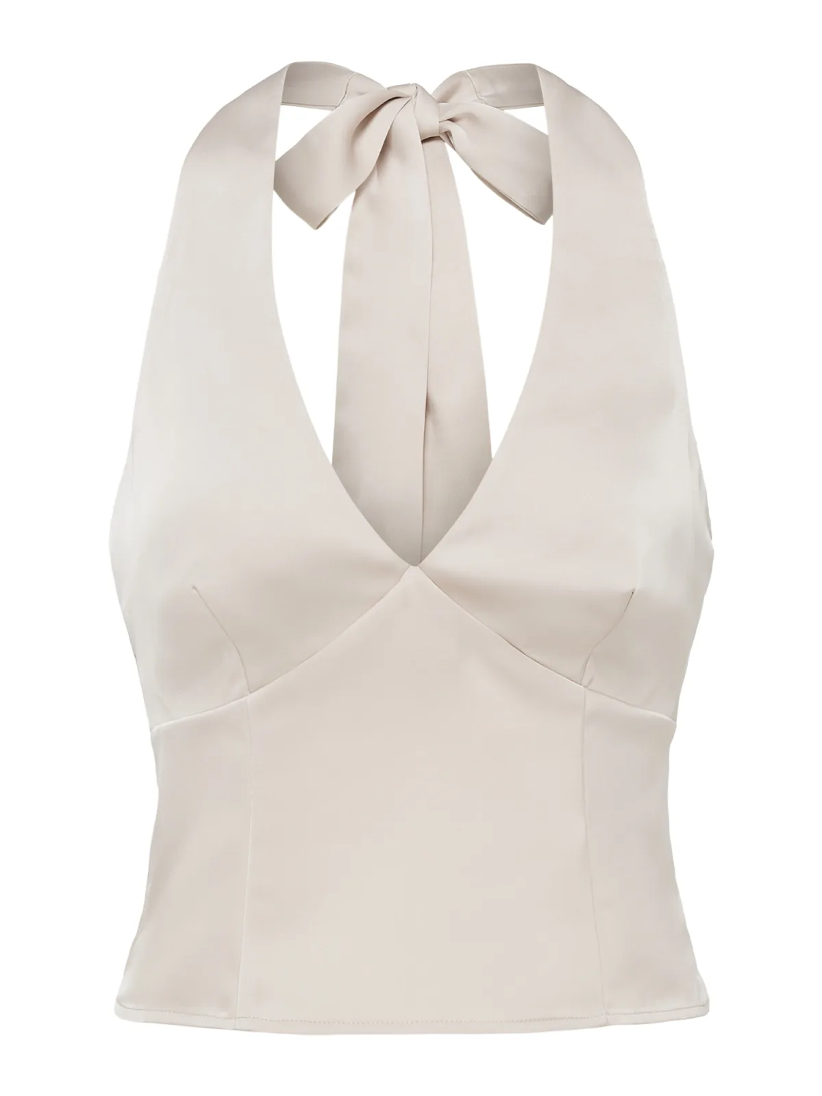 Design: Gevoerde zoom/rand, Diepe snit/decolleté, Om te knopen/binden; Materiaal: Gerecycled materiaal; Halstype: V-hals; Motief: Effen; Soort bandjes: Haltermodel; Details: Backless; Extra's: Op staal naden; Pasvorm: Slanke pasvorm; Armlengte: Mouwloos; Lengte: Korte pasvorm