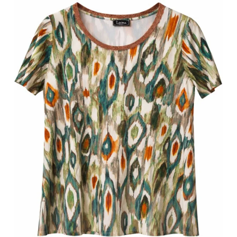 Basic shirt in een dessin met bladeren in zachte voorjaarstinten. Het shirt heeft een ronde halslijn met een effen glitter bies en een recht model met korte mouwen. Het shirt is gemaakt van een jersey kwaliteit en voelt soepel en zacht aan. Materiaal: 50% Viscose, 45% Polyamide, 5% Elastaan. Valt op de maat.