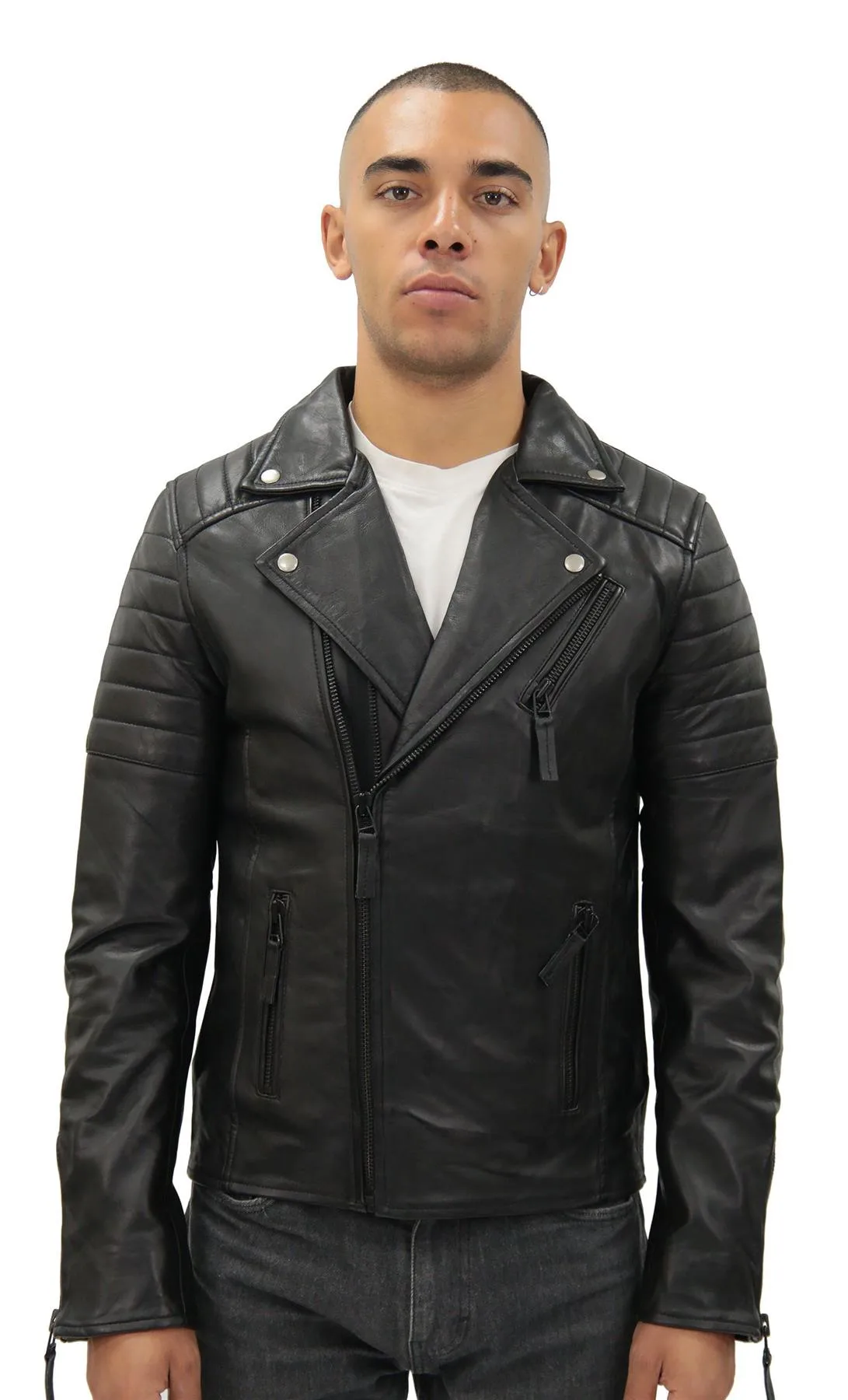 Dit jack, het middelpunt van een tijdloze look, is gemaakt van volnerf nappaleer voor een slim-fit, stijlvol bikersilhouet. Opvallende toevoegingen aan dit kledingstuk zijn onder meer geribde details op de schouders en een traditionele brede kraag. De voorkant van de jas is geaccentueerd met een dubbele ritssluiting en heeft een schuine zak met ritssluiting op de borst en nog twee zakken met ritssluiting. Deze jas is verkrijgbaar in verschillende kleuren voor verschillende smaken, zodat iedereen zijn ideale stijl kan vinden in dit klassieke Brando-stijlstuk. • 100% premium ultrazacht nappaleer. • Schuine borstzak met ritssluiting • Dubbele ritssluiting aan de voorkant, getagd voor gebruiksgemak • Brede revers met drukknopen • Zakken geïntegreerd in de voering van de jas • Stijlvolle manchetten met ritssluiting • Geribbelde details op de schouders