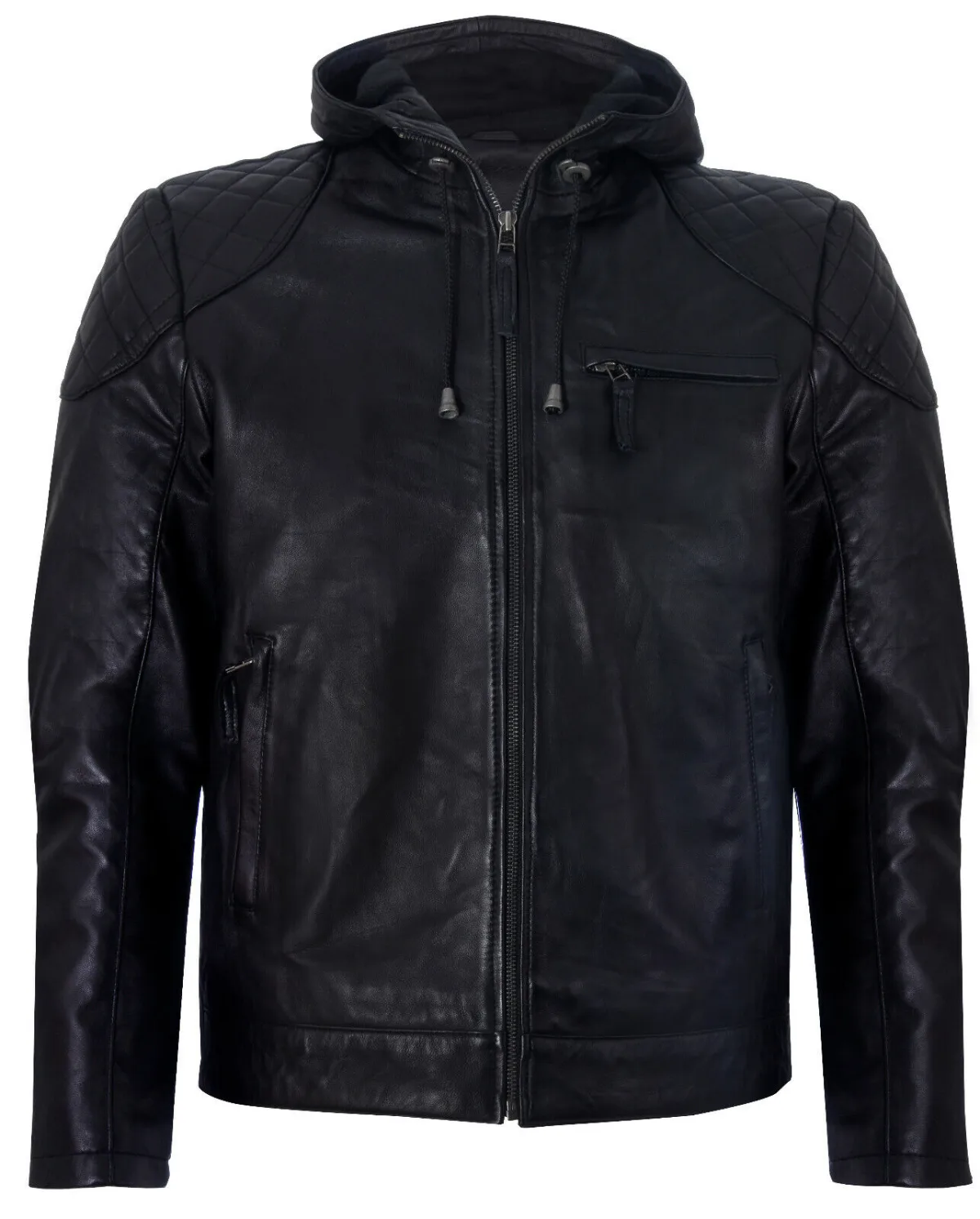 Leren bomber-bikerjack met rits en capuchon Prijzen
