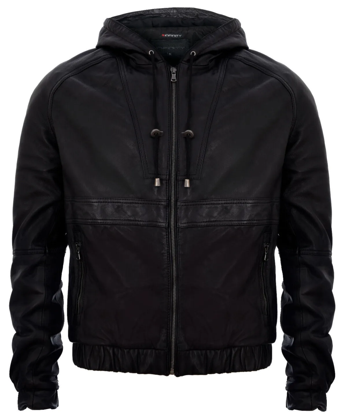 Leren bomber-bikerjack met rits en capuchon Prijzen