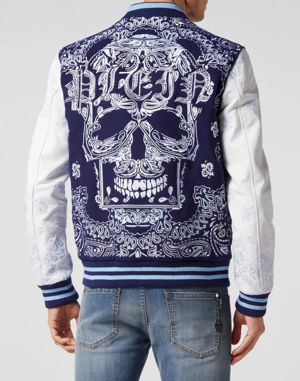 Ontdek de stijl van Plein met dit varsity jack van napa en geweven stof. Bekijk de kenmerkende details. Geweven stof van wolmix en leer met hertenprint Geborduurd paisley-patroon in bandanna-stijl PP Hexagon op patch van saffiaanleer op de linkerborst Drukknopen Twee steekzakken Ribgebreide boorden Voering van satijn met paisleyprint en ruitpatroon