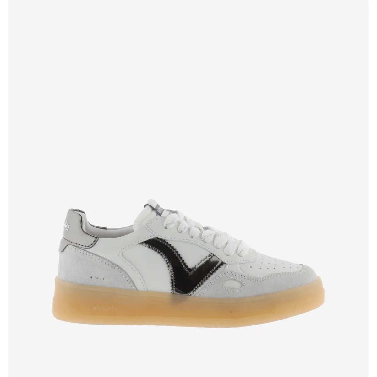 Witte leren sneakers met crème kleurige suède stukken. Venster-detail aan de zijkant. Ze hebben ook het logo victoria aan de zijkant en de achterkant in metallic tinten. De neus is perforated voor ademend vermogen. Karamel kleurige TPR zool.