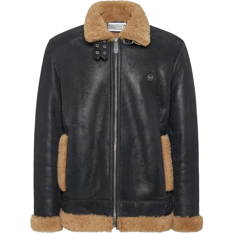 Discover the style of Plein with this sheepskin jacket. Check out its distinctive details. Sheepskin with fur trim finish Schafsfell shirt collar with two leather straps Schafsfell Skull&Bones on the back PP Hexagon Logo on a saffian leather patch sewn at left chest Zip fastener Two slit pockets with stitched outline Two side straps on bottom hem Unlined