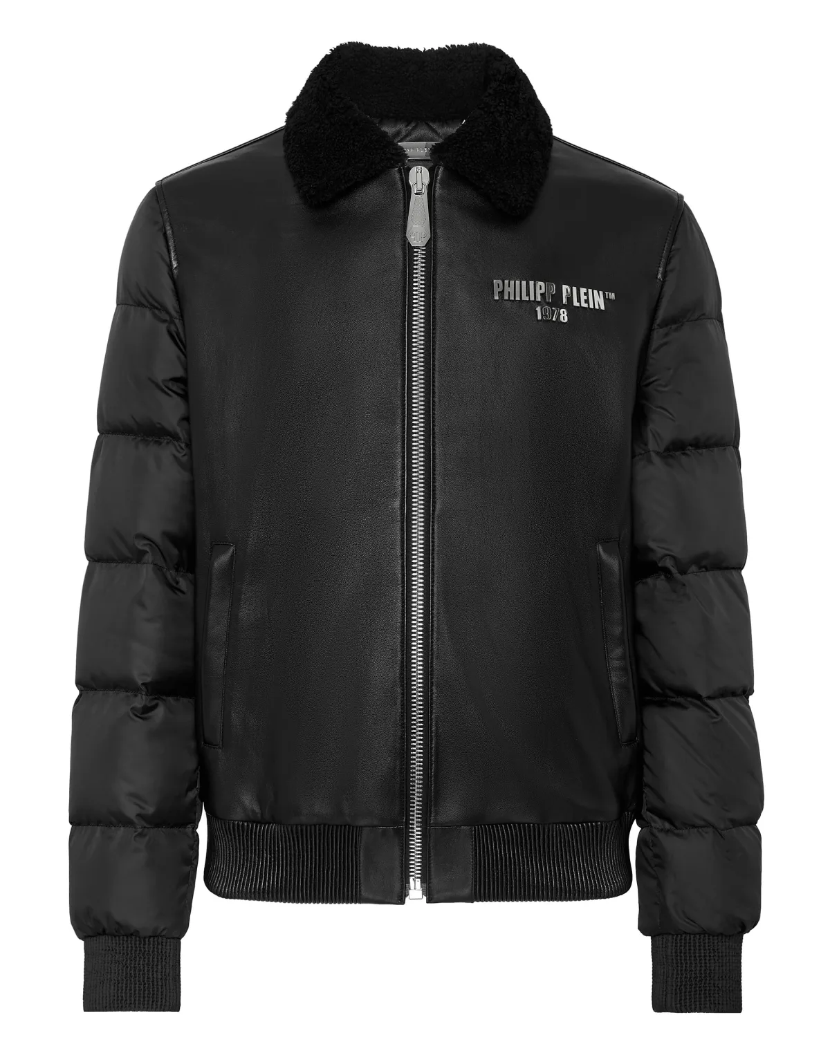 Deze bomber van nappa en nylon combineert de concepten van mode en werkkleding. Overhemdkraag van schapenvacht. Opschrift van het merk op de linkerborst. Ritssluiting en twee steekzakken. Geribde manchetten en onderkant. Gewatteerde en gewatteerde binnenvoering.