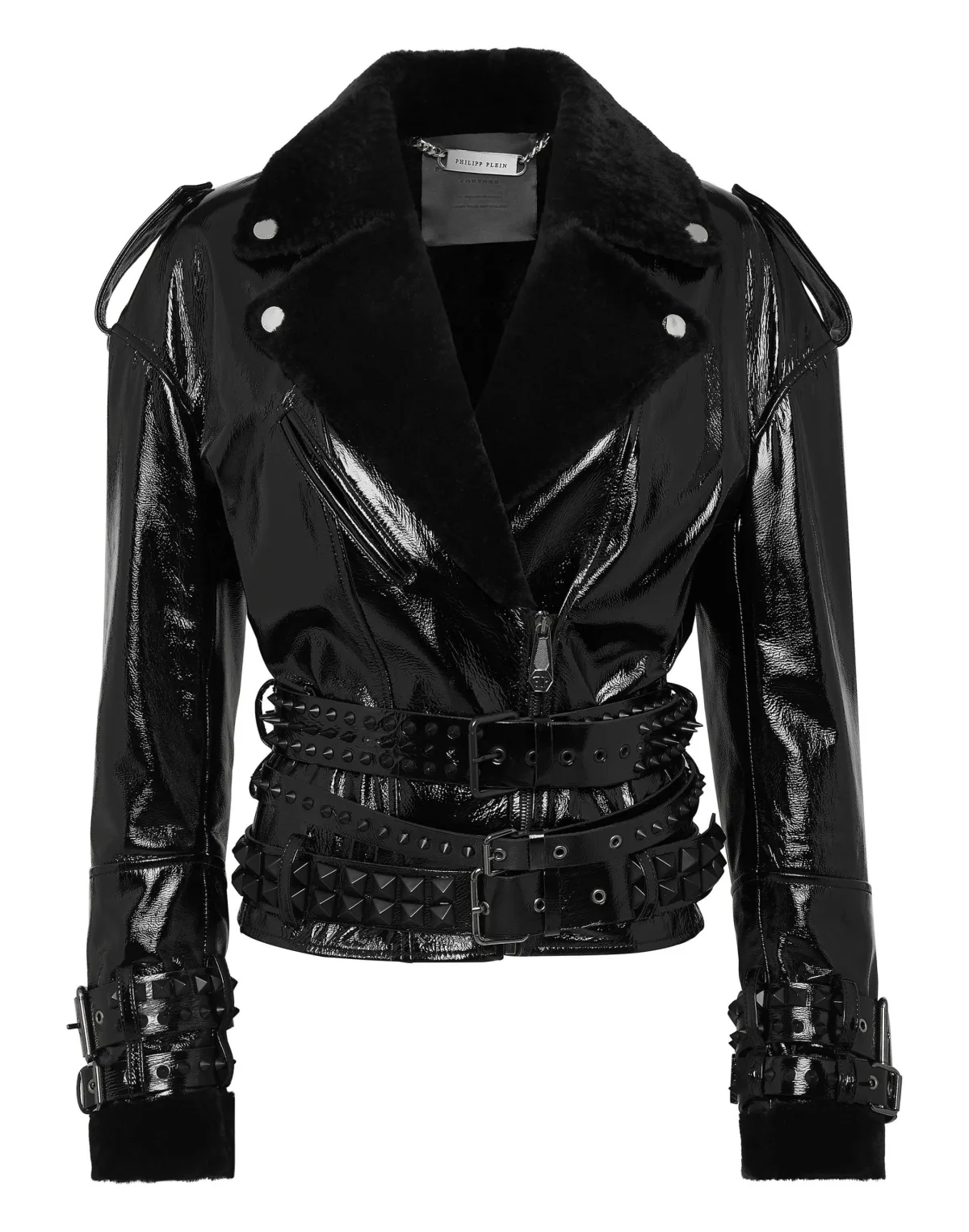 Bevrijd je rock spirit en verken nieuwe looks met de leren perfecto die we voor dit seizoen hebben ontworpen. Kijk naar de details. Zacht omgekeerd lam Bontkraag en -manchetten Drie riemen met studs en gesp op de taille Riemen met studs en gespen op de manchetten Metalen ritssluiting en zakken Bontvoering
