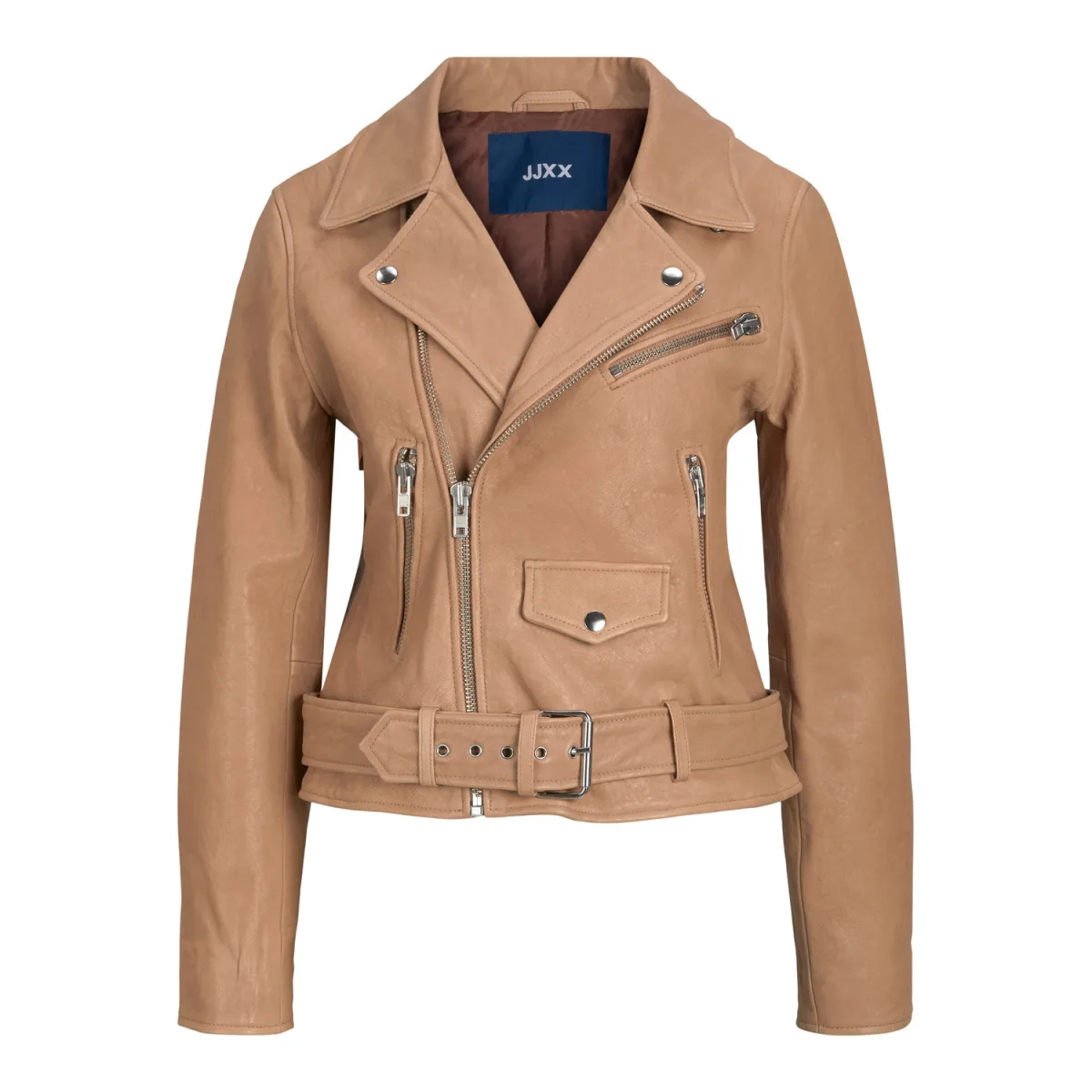 - Detail Type: Leren bikerjack- Fabric: Made of good quality soft leather for a comfortable fit and to ensure a long life for your wardrobe.- Sluiting: Asymmetrische rits aan de voorkant.- Extra details: ceintuur- Andere zak: borstzak met rits- Mouwen: manchetten met rits- Voering: Volledig gevoerd met 100% gerecycled polyester voering.- Handzak: Zijzakken met rits- HALS: Biker kraag- Mouw: Lange mouw (L/S)