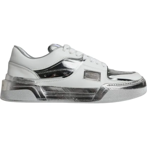 Stap naar buiten, val op en maak een statement. Ervaar de luxe van de Dolce & Gabbana Portofino sneakers, ontworpen om je dagelijkse stijl naar een hoger niveau te tillen. Het soepele witte leer, aangevuld met verfijnde zilveren metallic details, biedt duurzame, onderhoudsarme comfort. Geniet van stabiliteit dicht bij de grond met elke stap, dankzij de robuuste rubberen zool. De vetersluiting zorgt voor een veilige, verstelbare pasvorm. Deze stevige sneakers integreren naadloos in je levensstijl en voegen een vleugje Italiaanse ambacht toe aan elke gelegenheid.