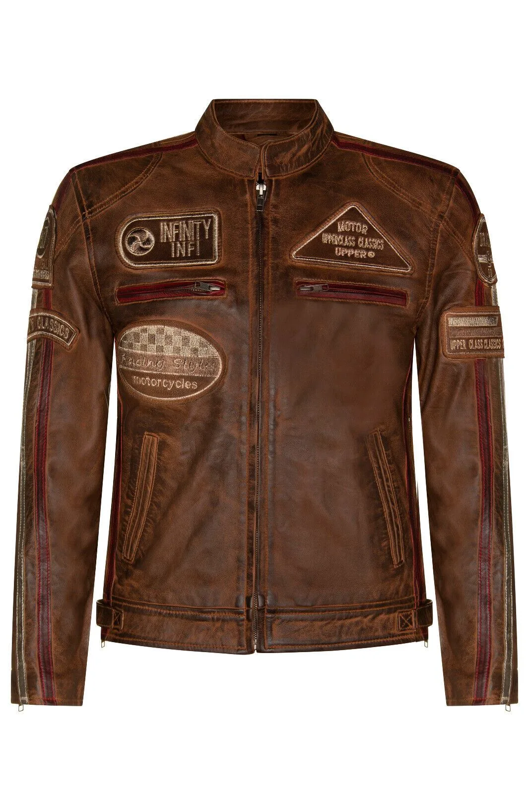 Afgewerkt met ons premium nappaleer en gedetailleerd met onze geborduurde vintage badges, hoeven raceliefhebbers niet verder te zoeken. De klassieke bikerstijl wordt naar een hoger niveau getild door de toevoeging van twee contrasterende racestrepen op de mouwen en een doordachte plaatsing van race-insignes om dit iconische kledingstuk te maken. Het jack blijft trouw aan zijn bikerroots met een klassieke korte kraag met tab en twee zakken met rits op de borst voor een traditionele look. Voor extra opbergruimte zijn er twee handzakken in de taille en nog eens twee compartimenten geïntegreerd in de voering, zodat deze jas even praktisch als stijlvol is. • 100% premium ultrazacht nappaleer. • Vier buiten- en twee binnenzakken • Racing-stijl strepen op elk van de mouwen van de jas • YKK-ritssluiting over de volledige lengte aan de voorkant • Geborduurde race-stijl badges op de voorkant en mouwen van de jas