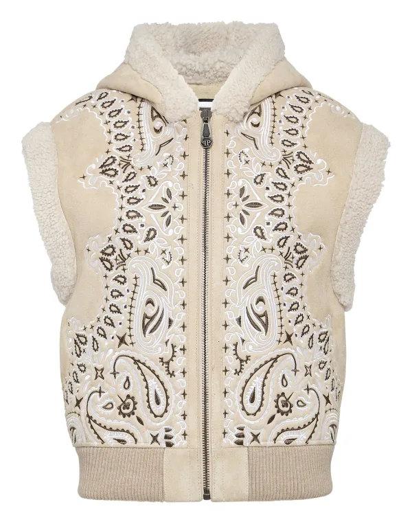 Ontdek de stijl van Plein met deze mouwloze jas van schapenvacht met capuchon. Bekijk de kenmerkende Paisley Bandanna details. Paisleypatroon in bandanna-stijl geborduurd omgekeerd lam De iconische doodskop geborduurd op de rug Ritssluiting Twee steekzakken Bontrand afwerking Ribgebreide onderboord