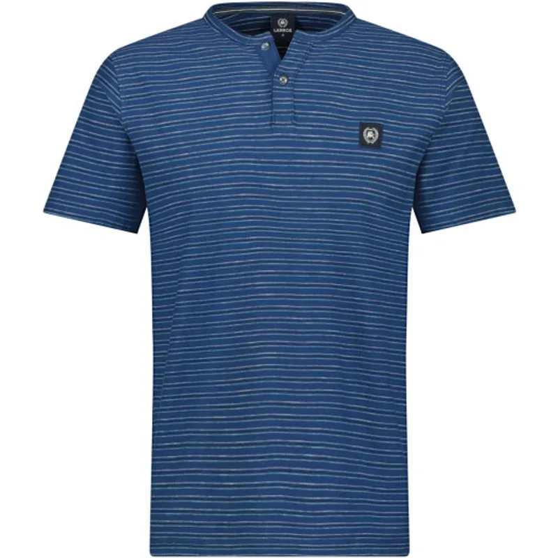 T shirt met korte mouwen en een v-hals voorzien van een knoopsluiting. Dit zomerse heren T-shirt heeft een allover streep patroon en op de borst klein het logo van Lerros. Regular fit 100% Katoen