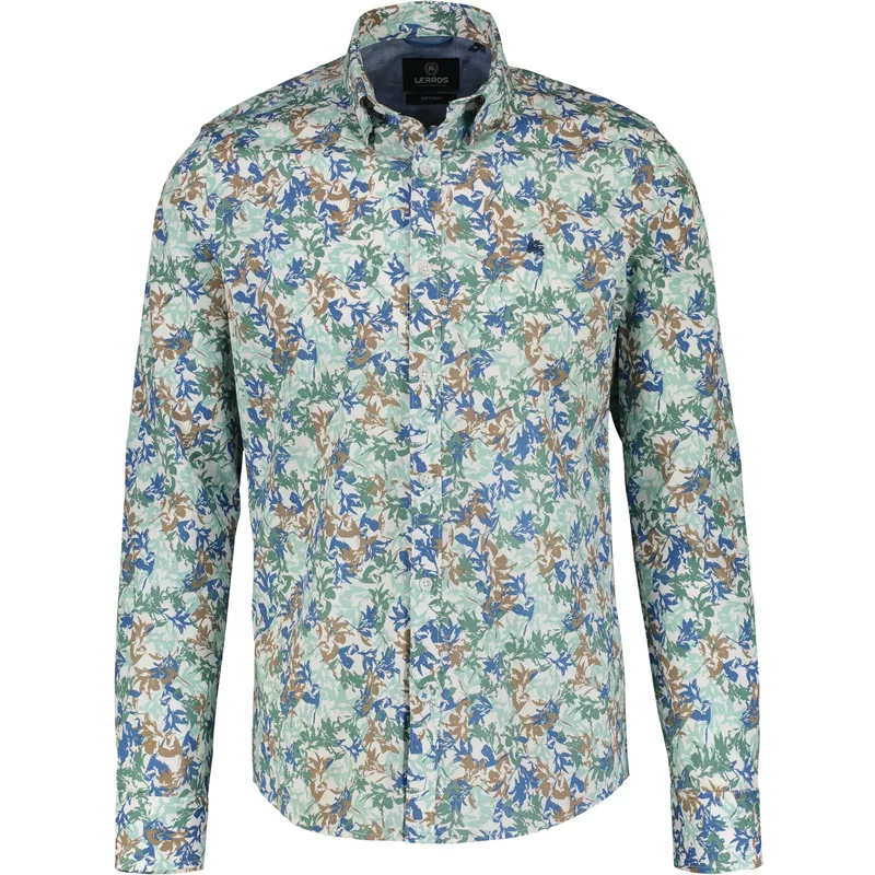 Het blauwe heren overhemd van Lerros heeft lange mouwen. Het overhemd heeft een all-over print. Op de linkerborst staat het welbekende logo van Lerros afgedrukt. Deze blouse is gemaakt van 97% katoen en 3% elastaan.
