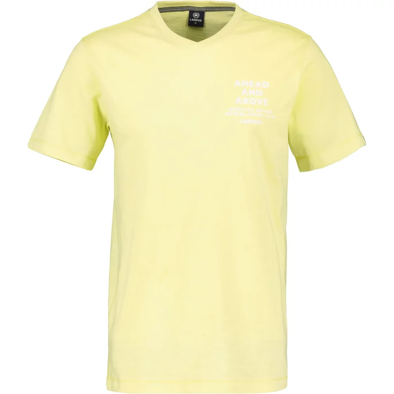 Dit gele shirt van Lerros heeft korte mouwen en een v-hals. Op de linkerborst staat een tekst afgedrukt. Dit shirt is gemaakt van 100% katoen.