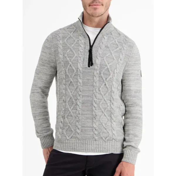 Gebreide kabel trui met opstaande kraag met ribgebreide afwerking en een ritssluiting tot op de borst. Extra details zijn: Opstaande kraag Ribgebreide afwerking RitssluitingMateriaal:60 % Katoen / 40 % PolyacrylWasvoorschrift:Machinewas max. Fijnwas 30 graden Celsius. Niet in droger